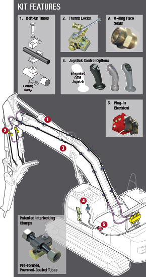 Recommended Option(s): OEM Monitor Flow Control (standard where applicable) - Electronic Function Select - Secondary Pressure Relief (standard on Komatsu) - Thumb Lock (standard feature)